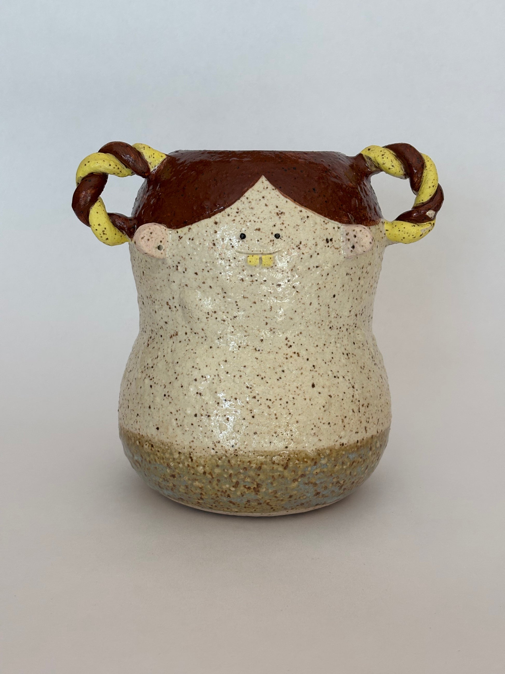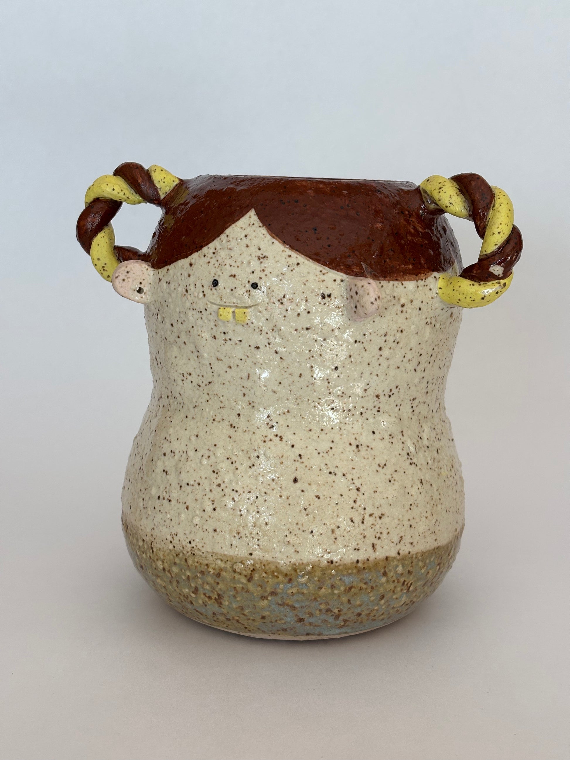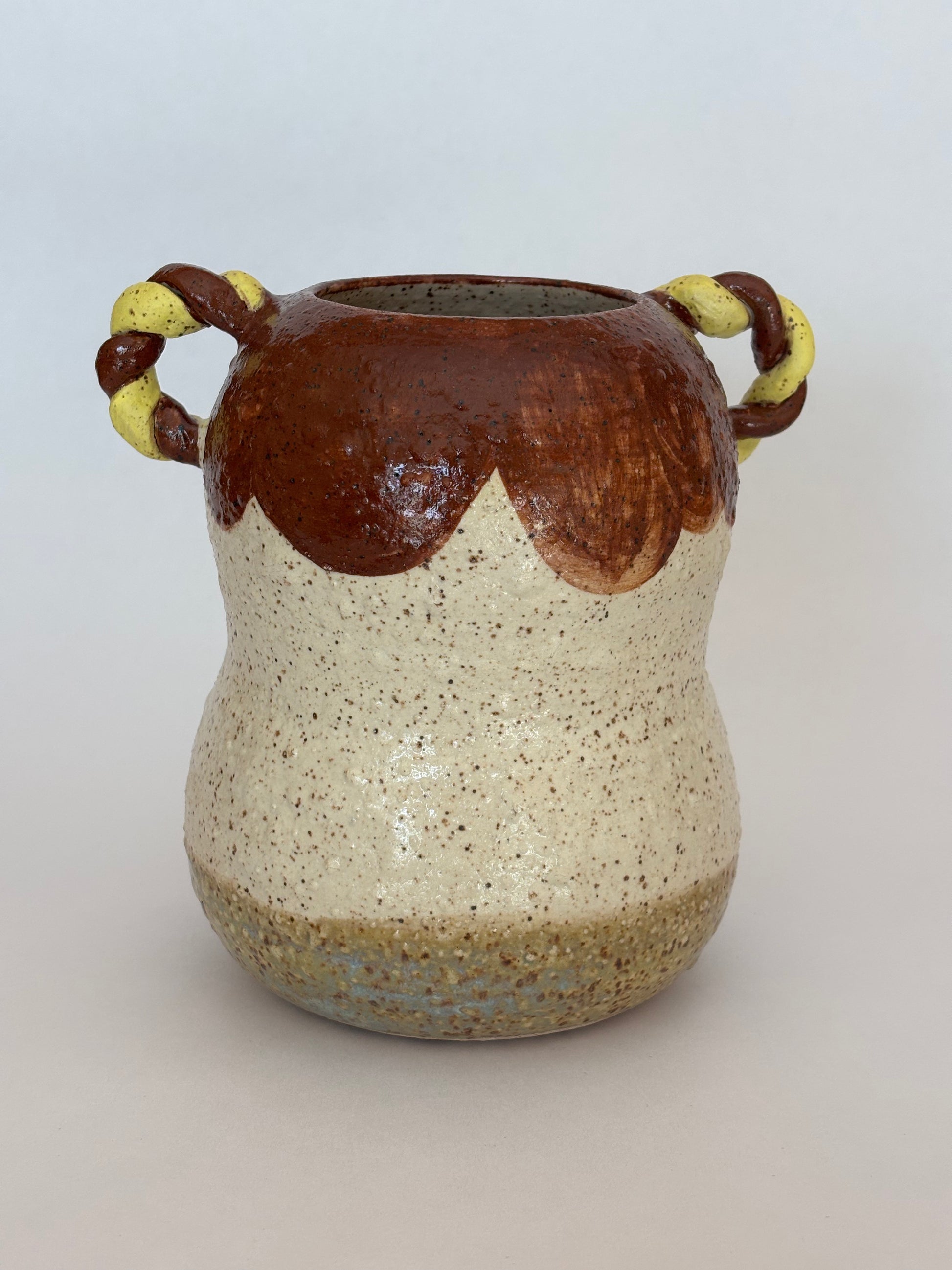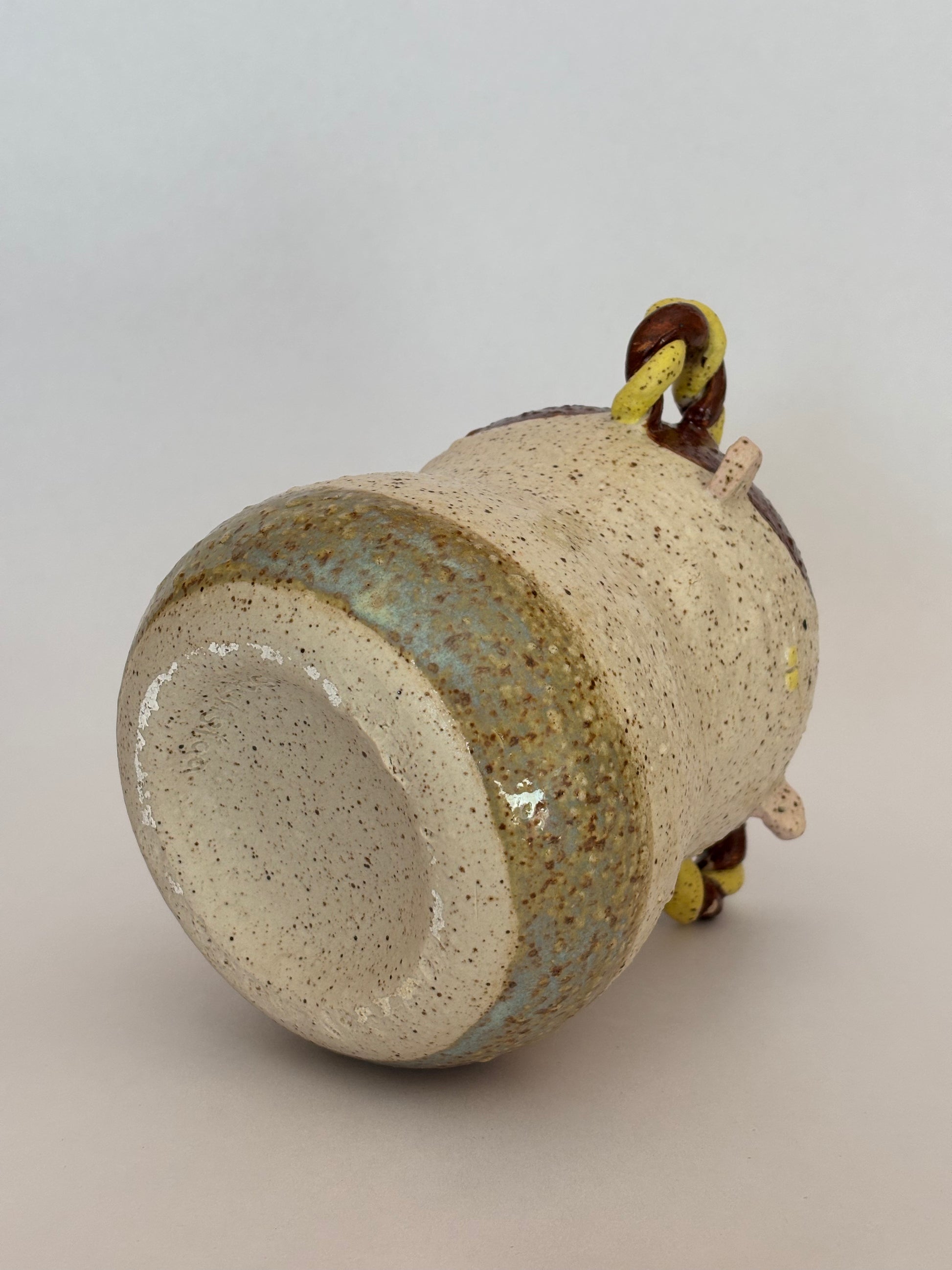 Jarrón modelado en torno y esmaltado con materiales de alta temperatura. Los detalles son en escultura manual.